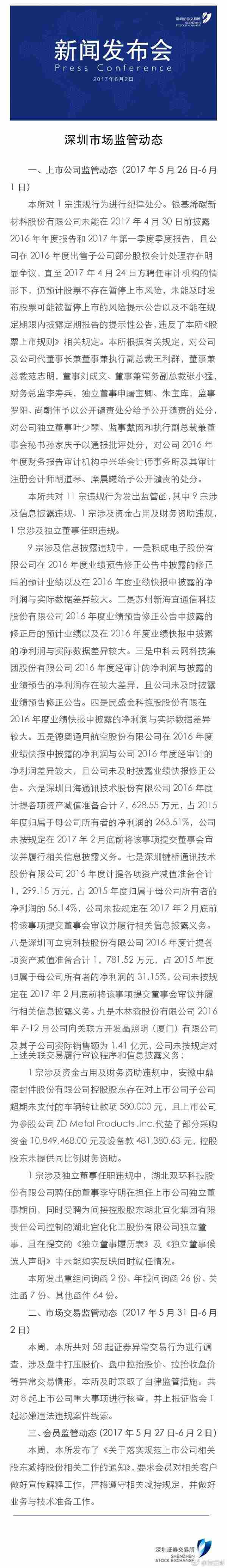深交所在披露的市场监管动态中表示,5月31日至6月2日共对58起证券异常交易行为进行调查,涉及盘中打压股价、盘中拉抬股价、拉抬收盘价等异常交易情形,及时采取了自律监管措施。