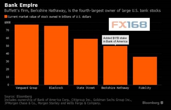 在2011年的交易中,巴菲特旗下的BERKSHIRE HATHAWAY INC.对美国银行投资50亿美元,获得了该行的优先股以及购买7亿股普通股的权利,目前这部分股权价值已经达到170亿美元。