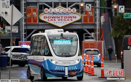 图为2017年1月12日,美国拉斯维加斯,电动无人驾驶公交车“Arma”在街头进行测试行驶。