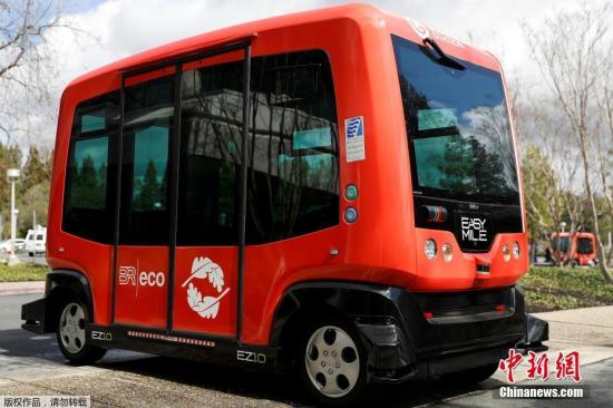当地时间3月6日,美国加州毕晓普兰奇,法国EasyMile公司生产的无人驾驶公交车EZ10正在当地部署测试。