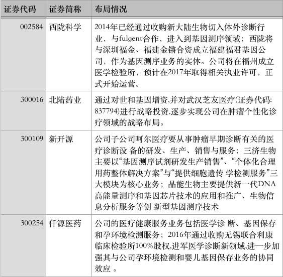 以无创产前基因检测领域为代表,市场上越来越多的新进入者进入该领域,目前,国内外市场上的主要参与者为华大基因、贝瑞和康、博奥生物、安诺优达、 凡迪生物、达安基因、Sequenom(已被LabCorp收购)、Verinata Health(已 被 Illumina,Inc.收购)、Ariosa(已被瑞士罗氏公司收购)、LifeCodexx、Natera。 其中,华大基因、贝瑞和康、博奥生物、安诺优达、凡迪生物、达安基因主要分布在中国和南亚市场;Sequenom、Natera、Verinata Health、Ariosa 主要分布 在北美市场,而 LifeCodeXX 专注于欧洲市场;仅有 Sequenom 公司涉足大洋 洲的市场,在澳大利亚设有分部。