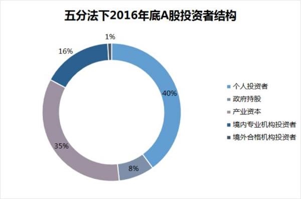 在这种分类法下,2016年底A股投资者结构中,个人投资者和产业资本是A股市场最主要力量。其中,个人投资者市值占比最高,为40%;产业资本市值占比34.6%,是资本市场的隐形大咖。此外,政府持股8.3%,以金融国资为主;境内专业机构投资者市值占比16.3%,其影响力在不断提升;境外合格机构投资者市值占比为0.9%,总体规模还非常小。