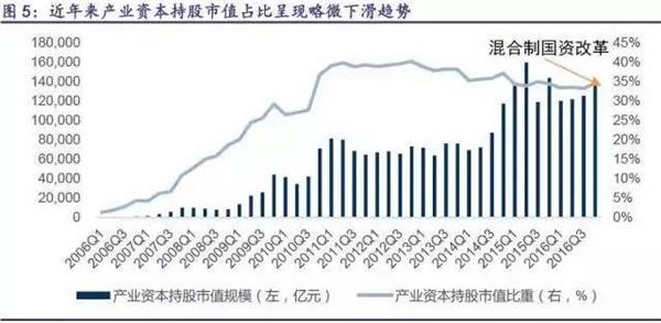 报告指出,股权分置改革后,原非流通股逐步全流通,因此产业资本持股占比在股改后显著快速提升,从2006年的4.3%持续上升到2012年的峰值40.2%。之后数值又开始下降,2016年为34.6%,与2015年基本持平并略有上升。数据说明,股权分置改革后,股份逐步全流通对投资者结构的影响已基本消除。也就是说,A股投资者结构其实就是A股上市公司的总体股权结构,变化同样反映A股上市公司股权结构的变化,在以混合制为主的国资改革推进下,上市公司股权治理显著改善。
