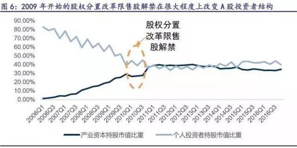 个人投资者持股市值比重也是从2009年开始急剧下滑,从2006年近70%的市值占比下降至2009年约38.7%的占比水平。