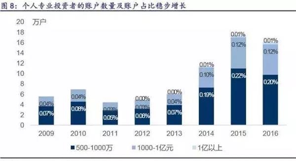 根据中证登公布的数据,截至2016年底我国个人投资者中持股市值规模超过500万的账户数量达到16.14万户,较2009年约5.5万户的数量呈现翻倍增长。