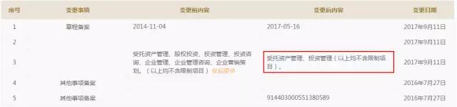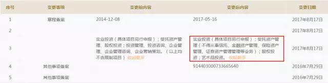 随后,9月11日,千合资本也进行了经营范围的调整,变更为“受托资产管理、投资管理(以上均不含限制项目)。”