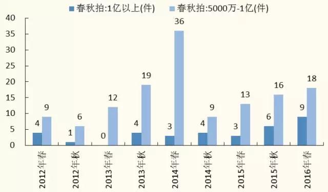 高价拍品是市场人气的重要风向标。2016年,春拍高价拍品数量持续放大,亿元以上拍品高达9件,创下近5年新高。