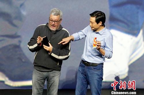 资料图:图为小米公司CEO雷军(右)与小米MIX工业设计师菲利普·斯塔克手持小米MIX2。中新社记者 李慧思 摄