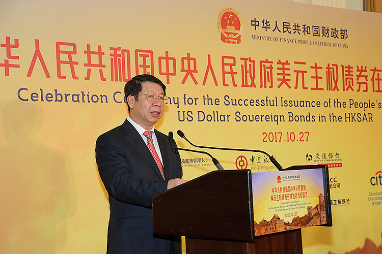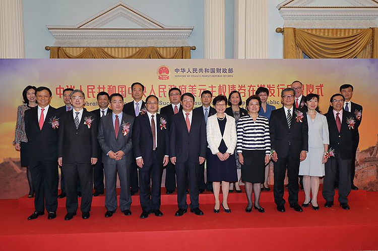 10月27日中午,中华人民共和国财政部在香港礼宾府举行发行仪式,宣布20亿美元主权债券发行成功。香港特别行政区(以下简称香港)行政长官林郑月娥女士特邀出席,对发债成功表示祝贺。中国财政部副部长史耀斌、中央人民政府驻香港联络办公室副主任仇鸿及三家承销商代表出席仪式并致辞。外交部驻港特派员公署副特派员胡建中、香港财政司司长陈茂波、香港财经事务及库务局局长刘怡翔、香港证券及期货事务监察委员会总裁唐家成、香港交易所总裁李小加出席了仪式。