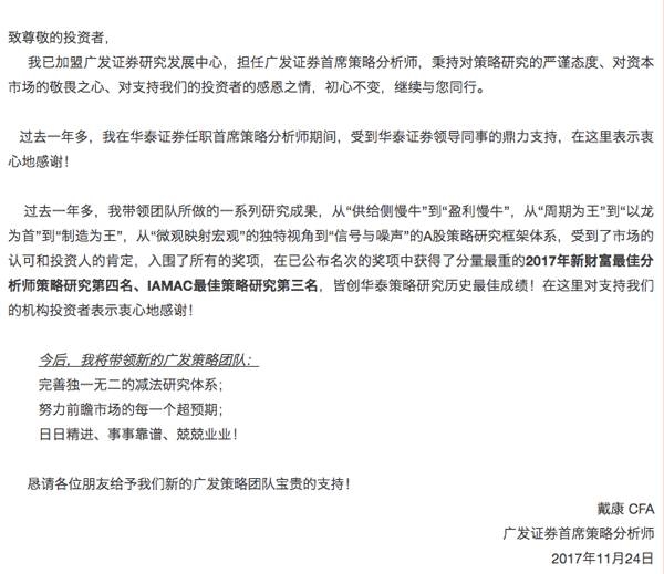 在颁奖当天,获得最佳策略研究第四名的华泰证券首席策略分析师戴康宣布,其已加盟广发证券研究发展中心,担任广发证券首席策略分析师。