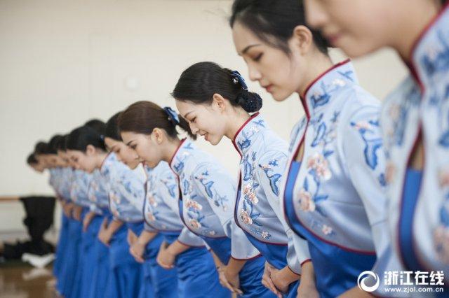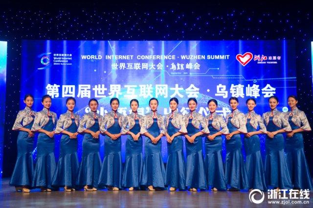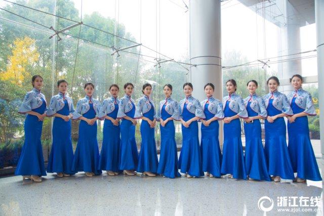 11月27日上午,嘉兴桐乡,第四届世界互联网大会·乌镇峰会志愿者出征仪式上,身着“乌镇蓝”的“小梧桐”志愿者闪亮登场。