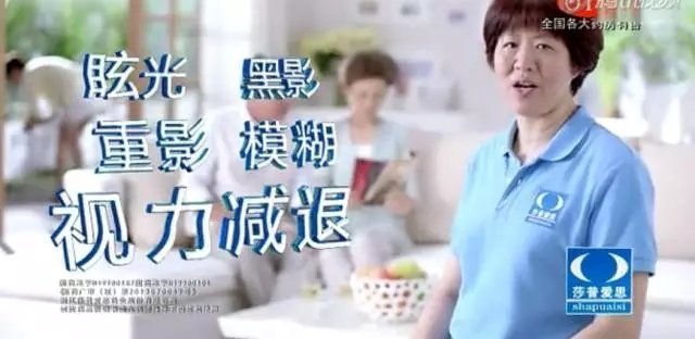 还有,广告也标注了“早期老年性白内障”字样。但是这几个字不是在旁白中提到的,而是在字幕中用较小的字体标注。