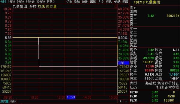 作为新三板历史上停牌时间最长的公司,九鼎集团(430719)终于复牌了。结果没有意外,截至15:00收盘,九鼎集团股价报收3.42元/股,大跌49.93%,达到最大跌幅限制,盘内总成交额为155万元。