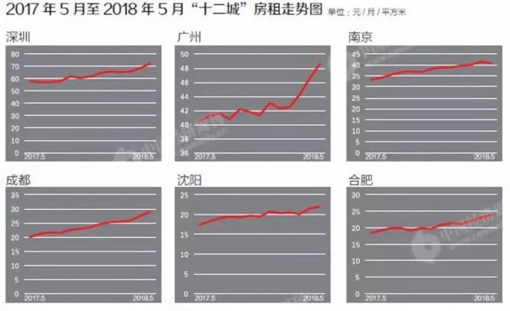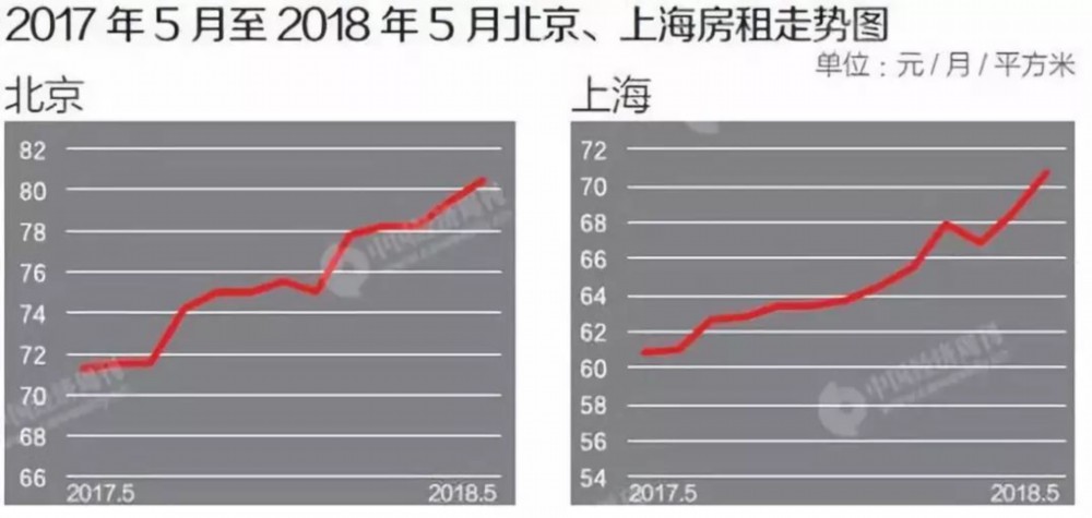 情况相似的还有同为一线城市的上海,从2017年5月到2018年5月,其房租均价从60.91元/月/平方米上升至70.76元/月/平方米,涨幅超过16%。