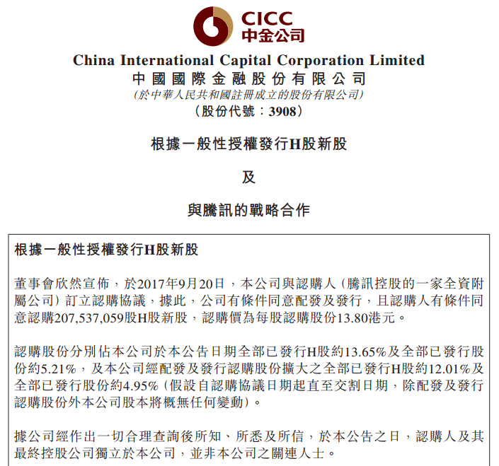 日前,中金公司在港交所公告,与腾讯控股有限公司签署认股协议,腾讯认购中金公司新发行的2.075亿股H股,分别占中金发行后H股的12.01%及总股本的4.95%。中金公司表示,此次发行尚需获得相关监管机构批准。