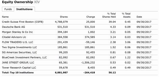 作为XIV ETN的创造者和最大持有者,瑞信手中的XIV ETN头寸高达479万单,恐成为本轮恐慌出逃的最大输家。根据最新的数据显示,截至昨天的收盘,瑞士信贷拥有持有479万单位的XIV,每单位115.55美元,总计超过5.5亿美元。