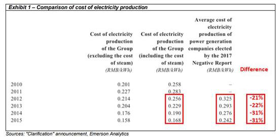 Emerson的10页重磅沽空报告,分析了中国宏桥的实际电力生产成本与澄清报告自相矛盾之处。首先是中国宏桥在2012到2015年的电力生产成本(包含蒸汽成本),比华能国际电力、华润电力、中国电力等独立发电商(IPP)低了三分之一。