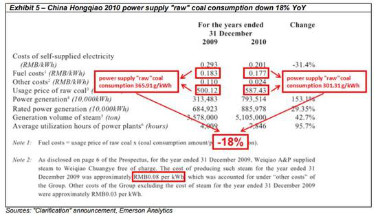 第三个问号与2月28日沽空报告一致,不理解中国宏桥在2010年的供电实物煤耗同比下跌了18%是怎么做到的。沽空报告援引了澄清报告透露的2009和2010年燃料成本(fuel cost)和原煤使用价格(usage price of raw coal),计算出了供电实物煤耗逐年下降。