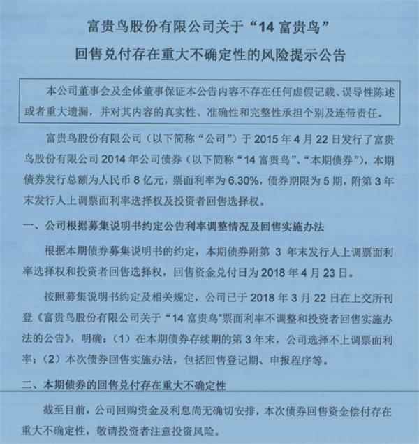 今日早间,富贵鸟公告称,“14富贵鸟”回售资金兑付日为4月23日。截至目前,公司回购资金及利息尚无确切安排,债券回售资金偿付存在重大不确定性,请投资者注意投资风险。