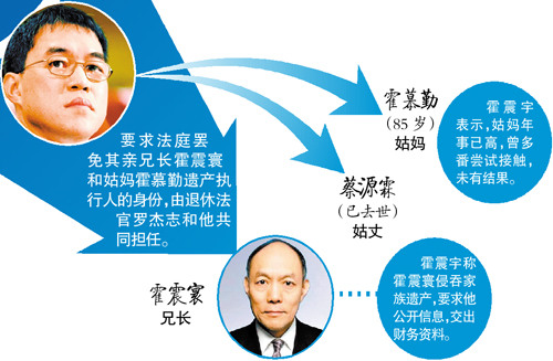 2011年12月,霍震宇的一纸诉状将霍家的财产争夺案引爆。作为霍英东遗产执行人之一,霍震宇状告包括霍震寰、霍慕勤及霍英东三房在内的16名家族成员,要求法院罢免霍震寰和霍慕勤两人的遗产执行人身份。现年85岁的霍慕勤是霍英东先生的胞妹,霍震宇的亲姑妈。