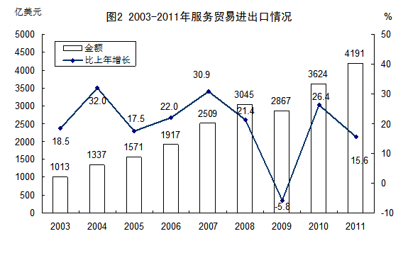 (一)贸易规模增长迅速,服务贸易大国地位显现。2011年,我国服务贸易进出口总额4191亿美元,比2002年增长3.9倍,年均增长19.3%。其中,出口1821亿美元,比2002年增长3.6倍,年均增长18.5%;进口2370亿美元,比2002年增长4.1倍,年均增长20.0%;增速比同期全球服务贸易进出口总额年均增速高10个百分点左右。服务贸易总额占世界服务贸易总额的比重从2.7%上升至5.2 %。其中,服务贸易出口在世界服务贸易出口中的比重从2.5%提高到4.4%,世界排名从2002年的第12位升至2011年的第4位;服务贸易进口在世界服务贸易进口中的比重从3.0%提高到8.1%,世界排名从第10位升至第3位。