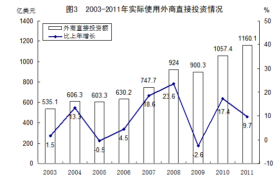 (一)利用外资规模跃居全球第二位。2003—2011年,我国非金融领域实际使用外商直接投资累计达到7164亿美元,年均增长9.2%。2011年,我国外商直接投资达1160亿美元,全球排名上升至第二位,并连续19年位居发展中国家首位。2007年外商直接投资突破700亿美元,2008年直接跨上900亿美元台阶。即使是在国际金融危机冲击较为严重的2009年,外商直接投资仍然超过900亿美元,降幅远低于全球平均水平。2010年,外商直接投资突破1000亿美元,达到1057亿美元。