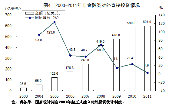 截止到2011年末,我国累计非金融类对外直接投资已达到3189亿美元。2011年,我国非金融类对外直接投资达601亿美元,比2003年增长19.7倍,年均增长46.4%。