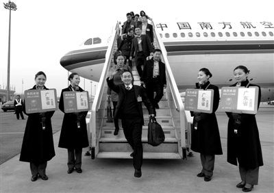 广东团代表向接机的工作人员招手致意。昨日,广东代表团到达北京。 新京报记者 赵亢 摄