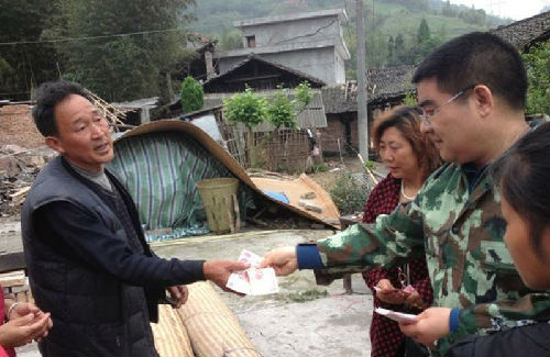 昨日(2013年4月20日)上午8时2分,在四川省雅安市芦山县发生7.0级地震, 震源深度13公里。昨日下午,陈光标带了13台大型机械以及棉被、电筒等抵达灾区,今日(4月21日)陈光标在地震现场安慰受灾群众,并将自己带来的30万元现金分发给灾民们。同时,当地群众还领到了水、食物、棉被、手电筒等救灾物资。