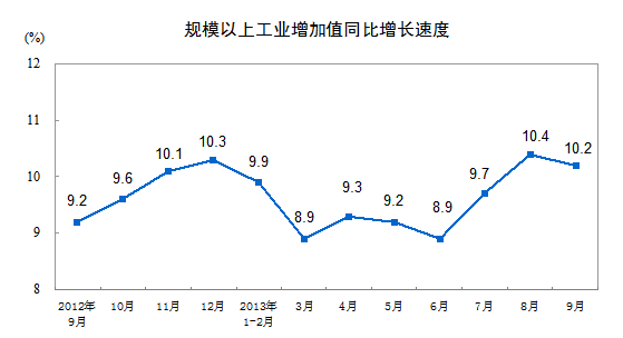 2013年9月份,规模以上工业增加值同比实际增长10.2 %(以下增加值增速均为扣除价格因素的实际增长率),比8月份回落0.2个百分点。从环比看,9月份,规模以上工业增加值比上月增长0.72%。1-9月,规模以上工业增加值同比增长9.6%。