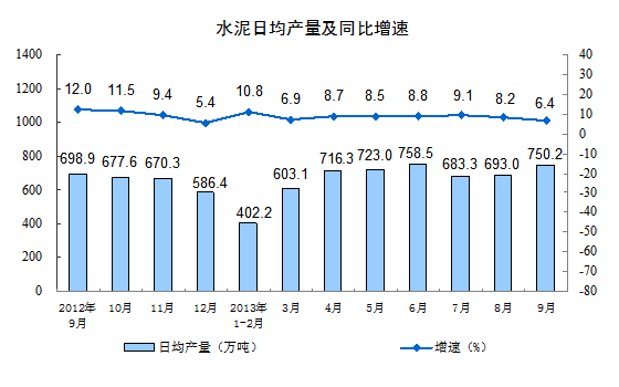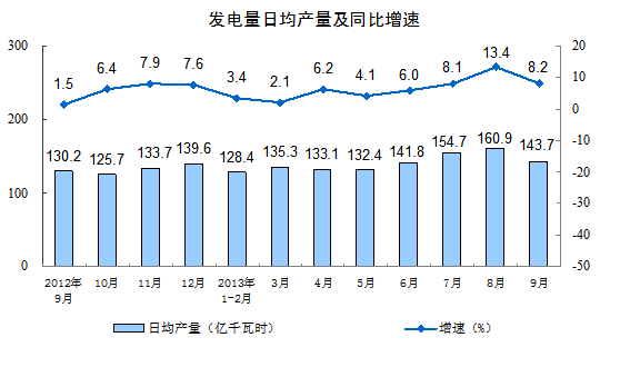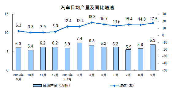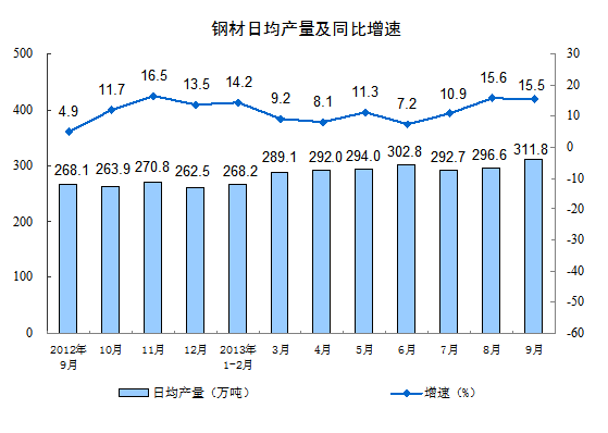 分产品看,9月份,464种产品中有304种产品同比增长。其中,发电量4310亿千瓦时,同比增长8.2%;钢材9355万吨,增长15.5%;水泥22505万吨,增长6.4%;十种有色金属345万吨,增长10.1%;乙烯127万吨,增长13.7%;汽车207.3万辆,增长17.5%;轿车113.8万辆,增长10.4%;原油加工量3865万吨,下降1.2%。