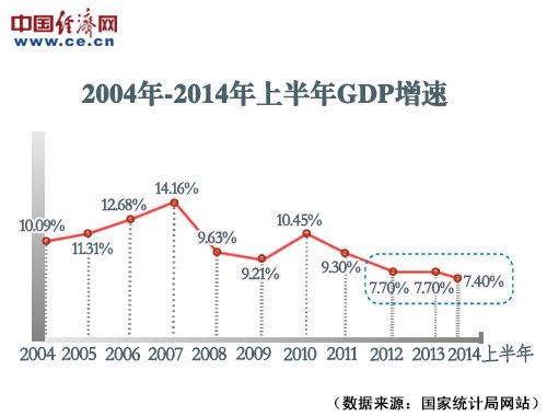中国经济网整理10年来的中国经济数据显示,GDP增速从2012年起开始回落,2012年、2013年、2014年上半年增速分别为7.7%、7.7%、7.4%,告别过去30多年平均10%左右的高速增长。郑汉星制图