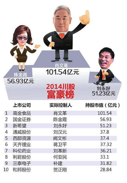 2013年年末,科伦药业董事长刘革新曾以56.71亿元的持股市值,蝉联了川股富豪榜榜首。眼下又是一年结束盘点时,高金食品的新任掌门人肖文革却以101亿元多的持股市值空降富豪榜首位。凭借全年大涨134.2%的国金证券,陈金霞则以56.93亿元的持股市值跃居第二。新希望刘永好持股市值51.2亿元紧随其后。
