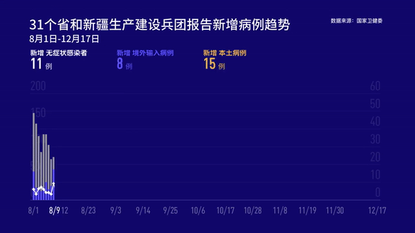 31个省(自治区、直辖市)和新疆生产建设兵团报告新增无症状感染者11例(境外输入9例);当日转为确诊病例1例(为境外输入);当日解除医学观察10例(境外输入9例);尚在医学观察无症状感染者198例(境外输入178例)。