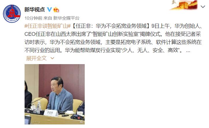 9日上午,华为创始人、CEO任正非在山西太原出席了“智能矿山创新实验室”揭牌仪式。他在接受记者采访时表示,华为不会拓宽业务领域,主要是拓宽电子系统、软件计算这些系统在不同行业的运用。华为能帮助煤炭行业实现“少人、无人、安全、高效”。
