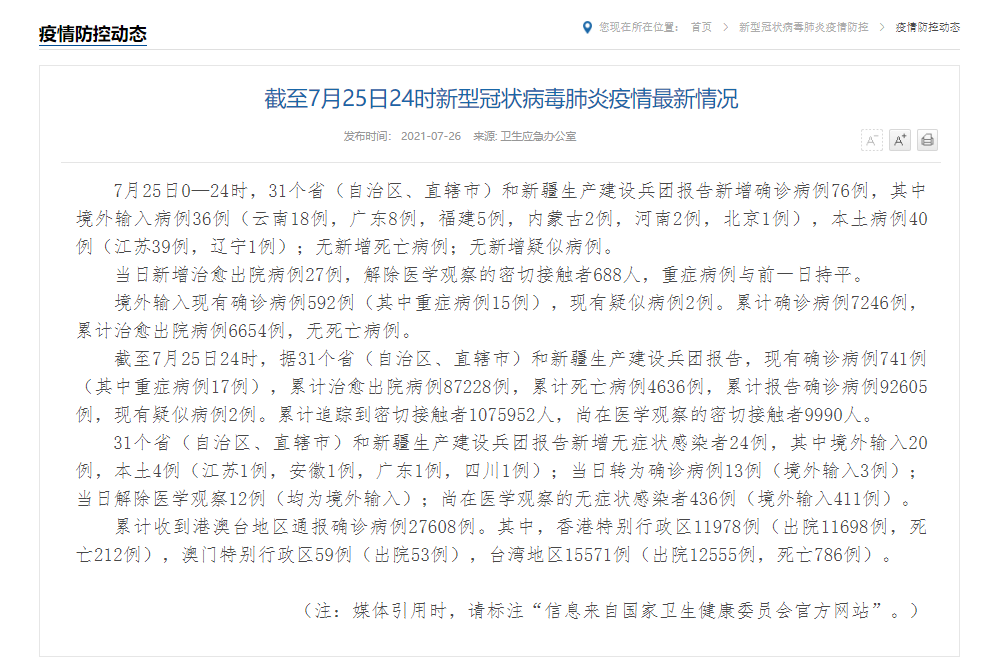 7月25日0—24时,31个省(自治区、直辖市)和新疆生产建设兵团报告新增确诊病例76例,其中境外输入病例36例(云南18例,广东8例,福建5例,内蒙古2例,河南2例,北京1例),本土病例40例(江苏39例,辽宁1例);无新增死亡病例;无新增疑似病例。
