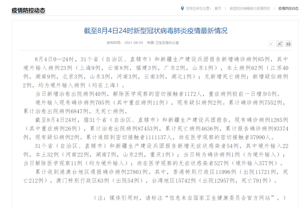 8月4日0—24时,31个省(自治区、直辖市)和新疆生产建设兵团报告新增确诊病例85例,其中境外输入病例23例(上海9例,云南8例,福建3例,广东2例,山东1例),本土病例62例(江苏40例,湖南9例,北京3例,山东3例,河南3例,云南3例,湖北1例);无新增死亡病例;新增疑似病例2例,均为境外输入病例(均在上海)。
