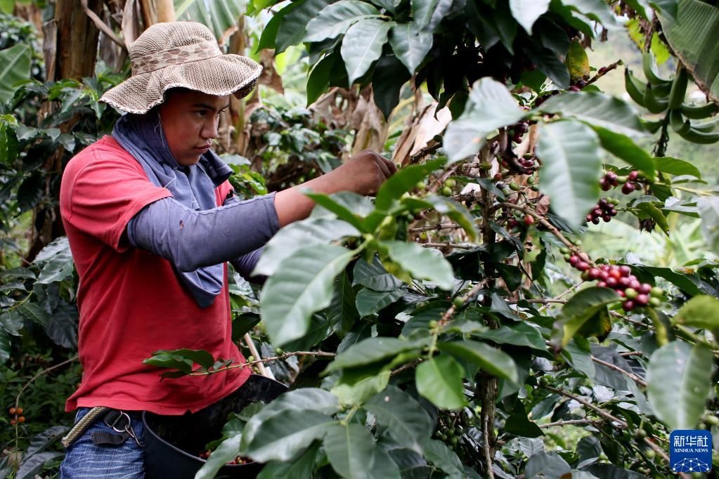 10月26日,农民在哥伦比亚安蒂奥基亚省希拉尔多一处咖啡种植园采摘成熟的咖啡果。新华社发