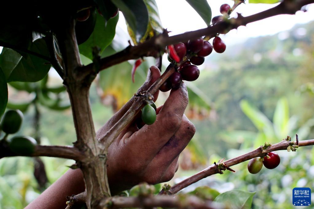 10月26日,农民在哥伦比亚安蒂奥基亚省希拉尔多一处咖啡种植园采摘成熟的咖啡果。新华社发