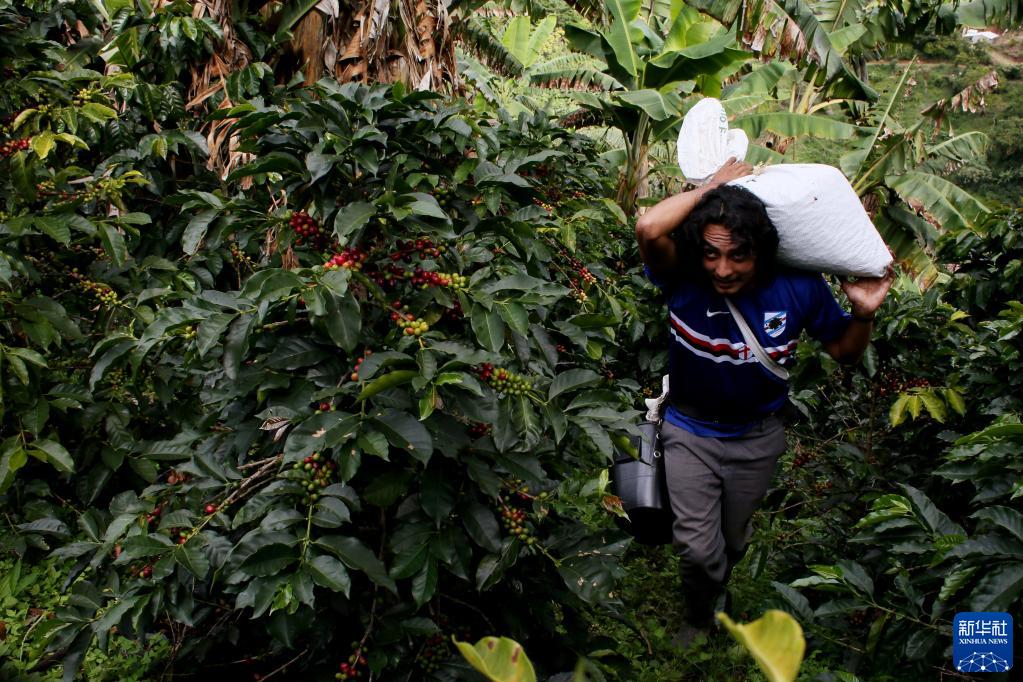 10月26日,农民在哥伦比亚安蒂奥基亚省希拉尔多一处咖啡种植园搬运采摘下的咖啡果。新华社发