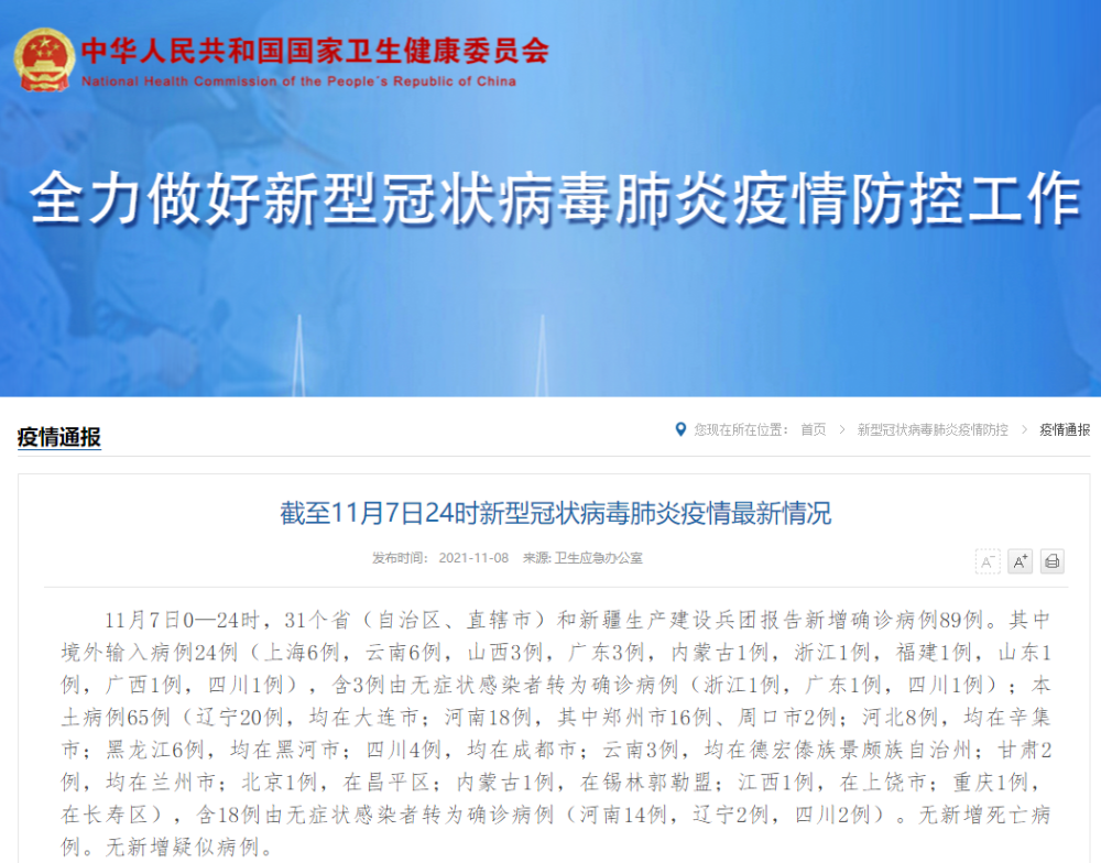 11月7日0—24时,31个省(自治区、直辖市)和新疆生产建设兵团报告新增确诊病例89例。其中境外输入病例24例(上海6例,云南6例,山西3例,广东3例,内蒙古1例,浙江1例,福建1例,山东1例,广西1例,四川1例),含3例由无症状感染者转为确诊病例(浙江1例,广东1例,四川1例);本土病例65例(辽宁20例,均在大连市;河南18例,其中郑州市16例、周口市2例;河北8例,均在辛集市;黑龙江6例,均在黑河市;四川4例,均在成都市;云南3例,均在德宏傣族景颇族自治州;甘肃2例,均在兰州市;北京1例,在昌平区;内蒙古1例,在锡林郭勒盟;江西1例,在上饶市;重庆1例,在长寿区),含18例由无症状感染者转为确诊病例(河南14例,辽宁2例,四川2例)。无新增死亡病例。无新增疑似病例。