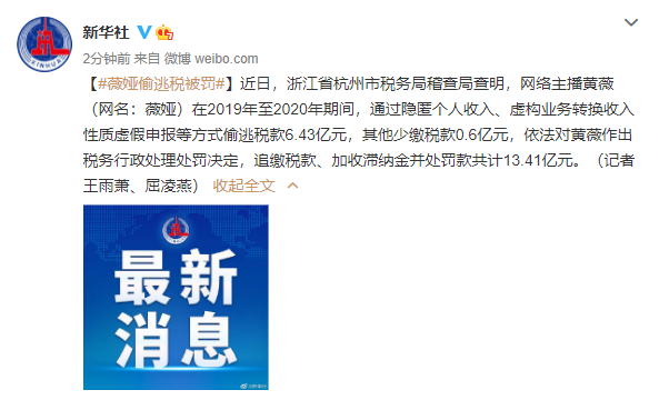 12月20日,税务部门公布了对网络主播黄薇(网名:薇娅)偷逃税的处理结果。黄薇通过隐匿个人收入、虚构业务转换收入性质进行虚假申报偷逃税款,被依法追缴税款、加收滞纳金并处罚款,共计13.41亿元。