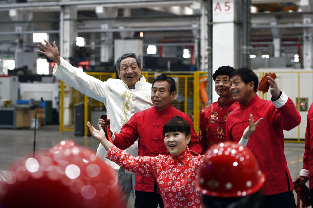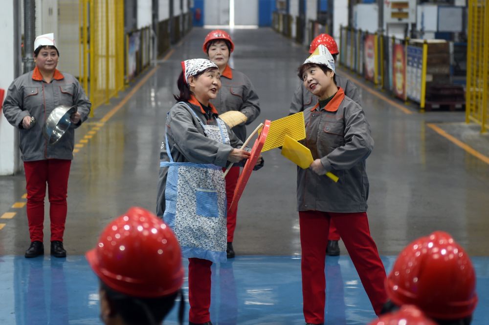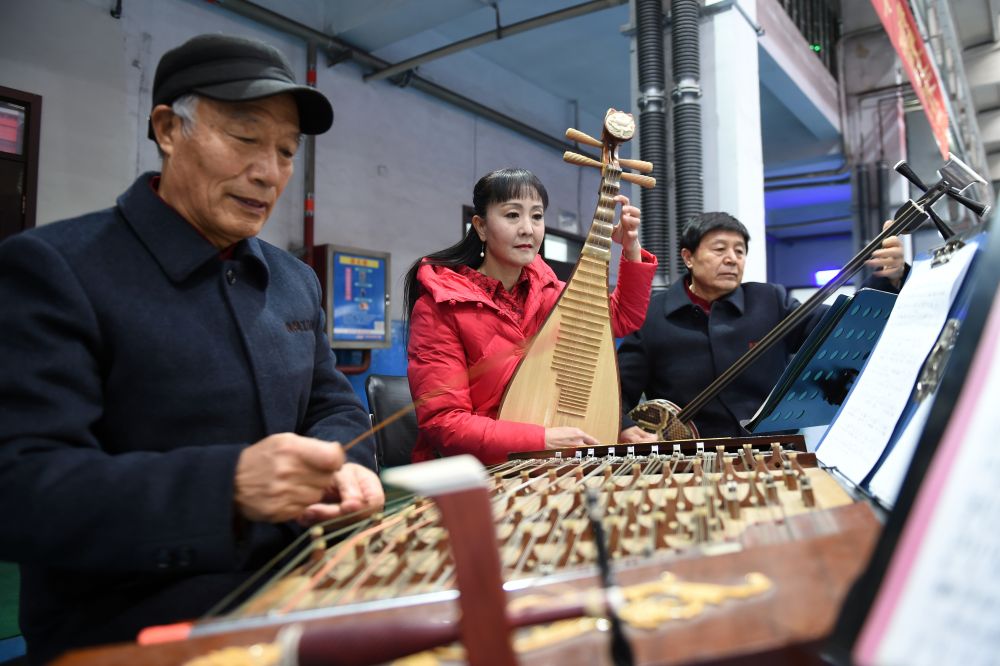↑2月13日,在河北电机股份有限公司生产车间,李俊岐(左一)与石家庄市栾城区楼底农民工俱乐部成员在现场演出节目。新华社记者 骆学峰 摄