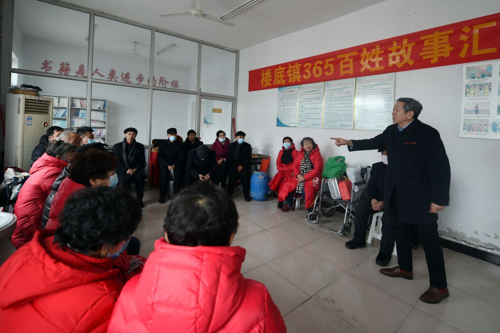 ↑2月13日,在石家庄市栾城区楼底农民工俱乐部,李俊岐(右一)与俱乐部成员在总结当天演出经验教训。