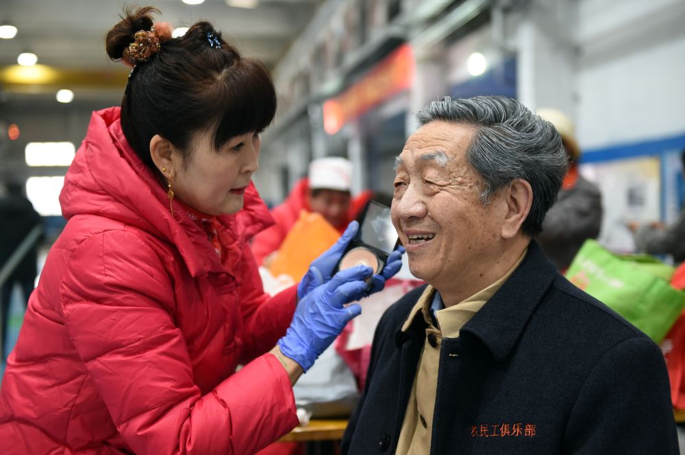 ↑2月13日,在河北电机股份有限公司生产车间,石家庄市栾城区楼底农民工俱乐部成员在为李俊岐(右)化妆。新华社记者 骆学峰 摄