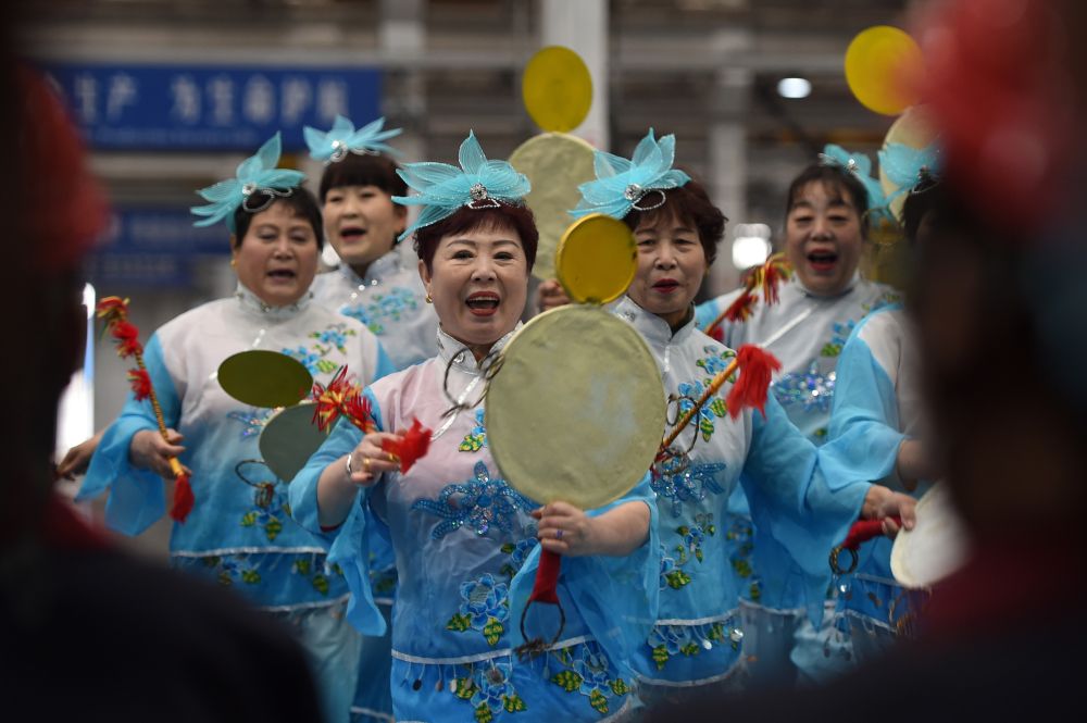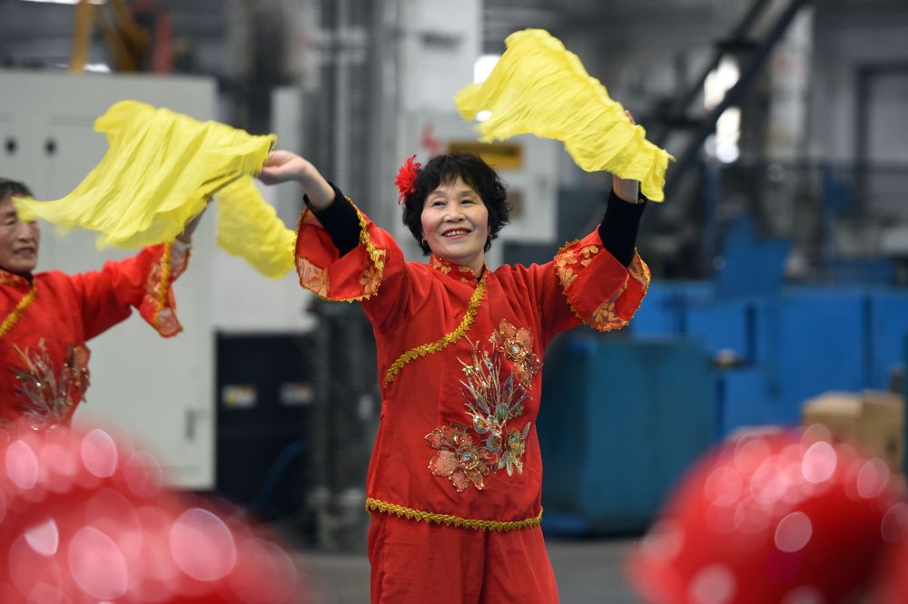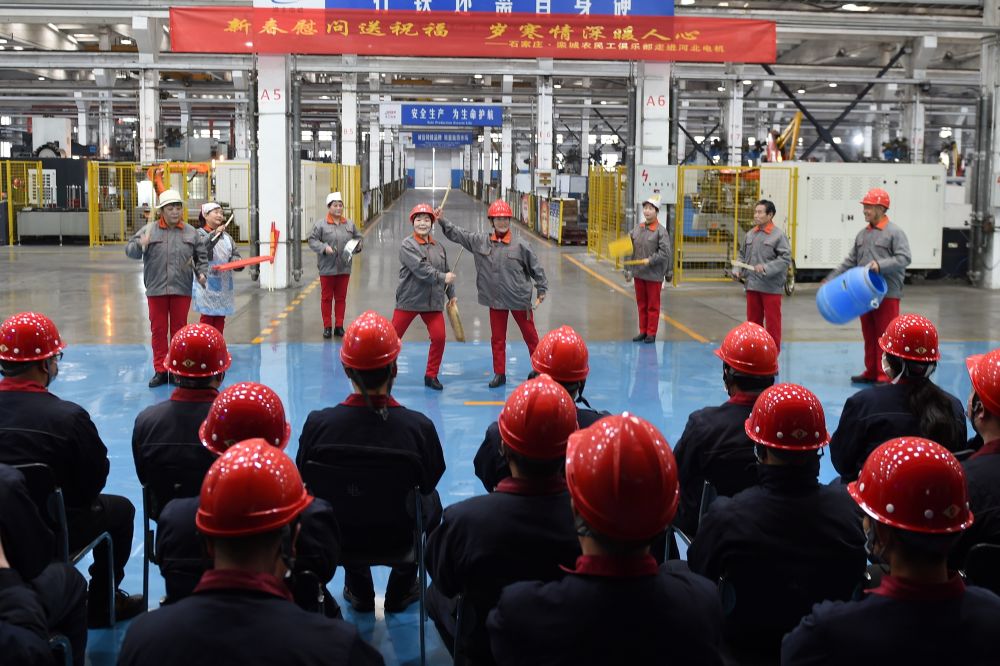 ↑2月13日,在河北电机股份有限公司生产车间,石家庄市栾城区楼底农民工俱乐部成员在现场演出节目。新华社记者 骆学峰 摄