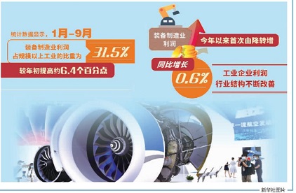 具体来看,装备制造业利润由降转增,工业企业利润行业结构不断改善。朱虹说,1月至9月,装备制造业利润同比增长0.6%,今年以来首次由降转增,拉动规模以上工业企业利润增速较1月至8月回升0.8个百分点。装备制造业利润占规模以上工业的比重为31.5%,较年初提高约6.4个百分点。