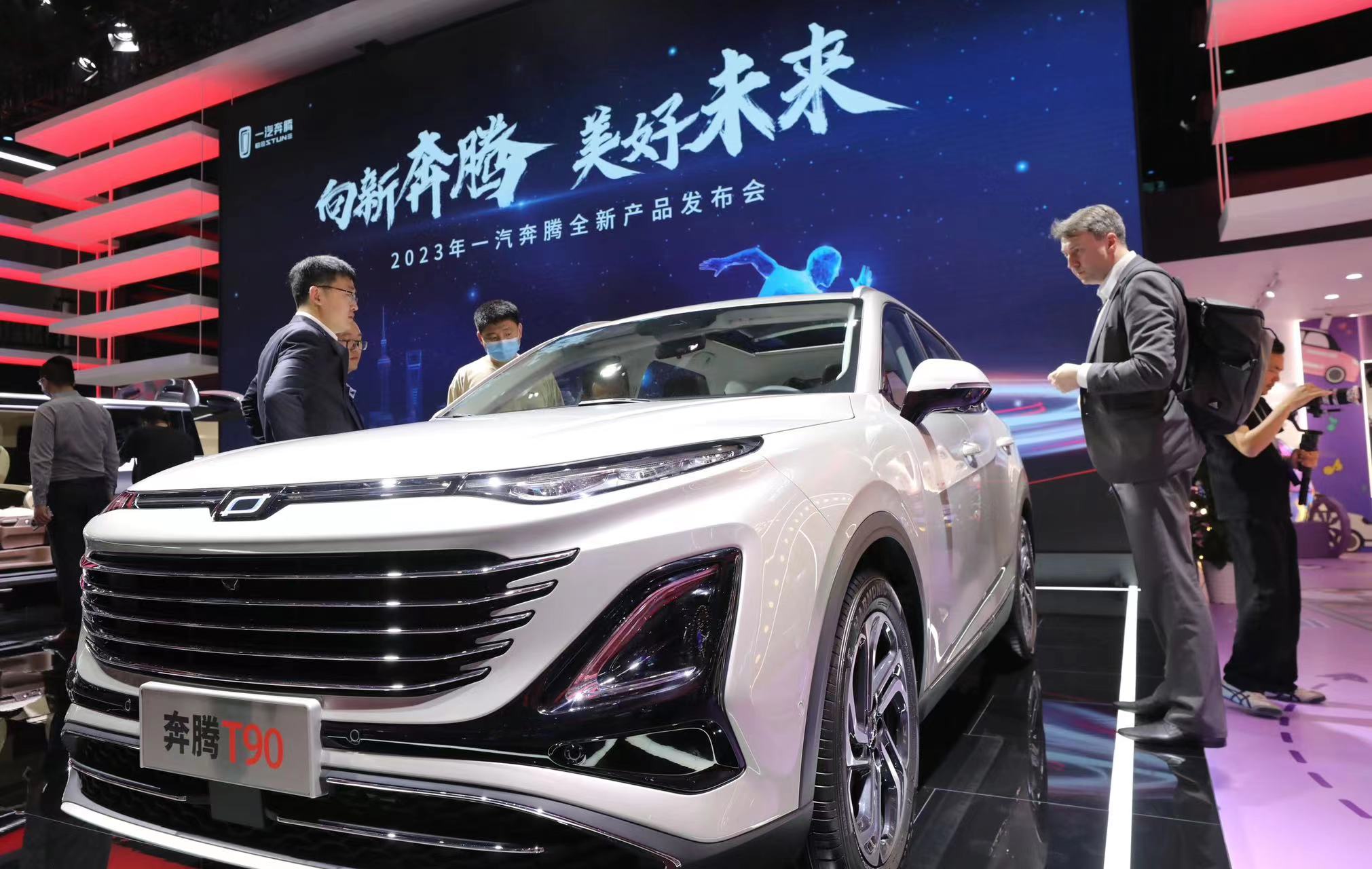 4月18日,参观者在一汽奔腾品牌展台上驻足。