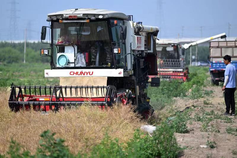 5月29日,两台联合收割机在油菜田里作业。当日,天津市北辰区大张庄镇田庄村的1100亩油菜田,开始集中收割菜籽。联合收割机将在三天内完成采收,为下一轮种植高粱留出时间。