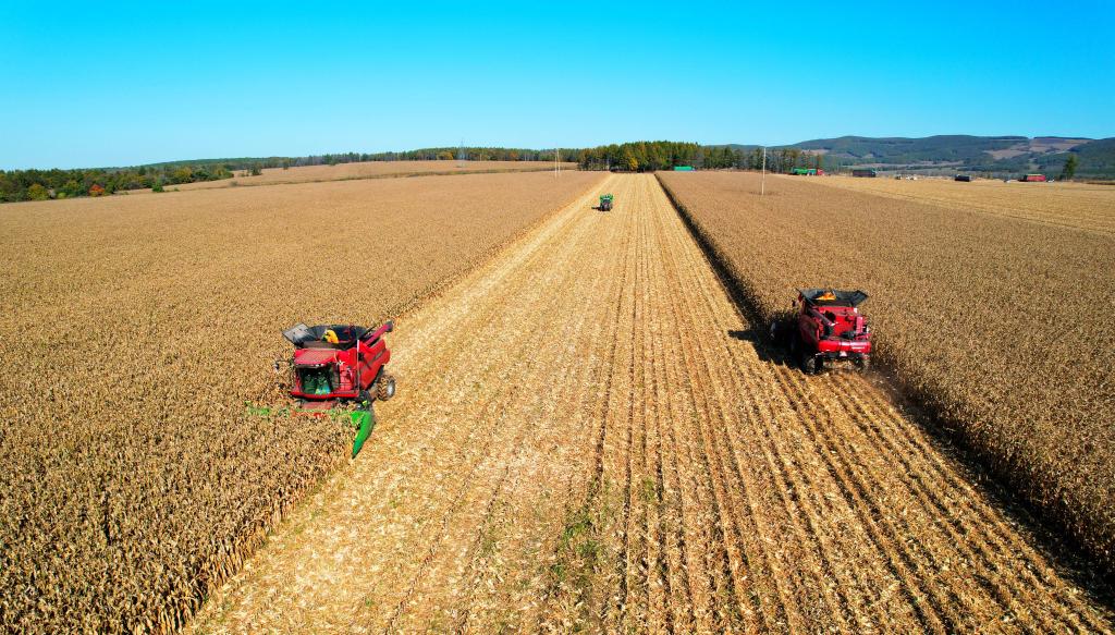 北大荒集团双峰农场有限公司机械收获玉米。(北大荒集团双峰农场有限公司供图)